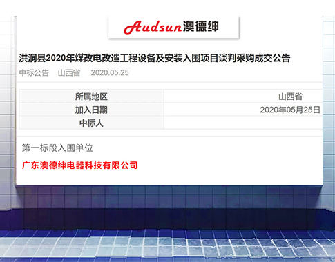 廣東澳德紳電器科技有限公司入圍山西洪洞縣2020年“煤改電”項(xiàng)目!